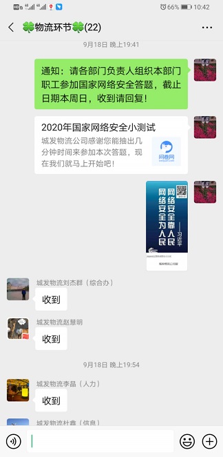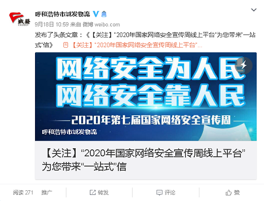 9月14日至20日,根據(jù)城發(fā)公司2020年國家網(wǎng)絡(luò)安全宣傳周實(shí)施方案要求,城發(fā)物流公司組織全體黨員干部職工積極開展2020年國家網(wǎng)絡(luò)安全宣傳周系列活動。