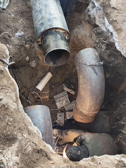9月27日,展東路與海拉爾大街十字路口的一次網(wǎng)跑水,開挖后發(fā)現(xiàn)相鄰的排污管道有破損,供熱管道浸泡在污水中,腐蝕嚴(yán)重,需要先處理好污水管道才能搶修熱力管道,增大了施工難度。經(jīng)過幾次嘗試,最終決定對漏點處進行線位改遷,重新鋪設(shè)管道。經(jīng)過10天持續(xù)不斷、緊張輪流作業(yè),于10月6日中午,終于修復(fù)管網(wǎng)漏點,保證了管網(wǎng)注水試壓。
