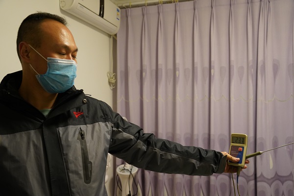 在20號樓3單元6樓的住戶家中,劉婷用手摸了摸用戶家的地板磚,通過人體的直觀感受,發(fā)現(xiàn)用戶家地暖存在散熱不均勻的現(xiàn)象。客服管家用專業(yè)的測溫儀和熱成像儀,進行了測溫。經(jīng)檢測,該用戶家各房間平均溫度均在23℃以上。用戶說,家中較冷的房間是廚房,客服管家又針對廚房進行了測溫,發(fā)現(xiàn)室溫要比其他房間溫度低一些,但熱成像儀測得的結果與其他房間一致。經(jīng)過觀察與分析,發(fā)現(xiàn)用戶家廚房與陽臺間的隔斷是一扇落地大玻璃門,保溫效果較差,導致廚房溫度低于其他房間。聽了工作人員的講解,用戶也表示了認可,對我們的排查結果及服務態(tài)度表示滿意。