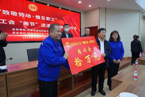 隨后,自治區(qū)總工會(huì)副主席傲木格同志發(fā)表了講話。自治區(qū)總工會(huì)黨組書記張慧宇宣布全區(qū)工會(huì)"兩節(jié)"送溫暖活動(dòng)正式啟動(dòng),并為市城市燃熱集團(tuán)送上了十萬元的慰問金。