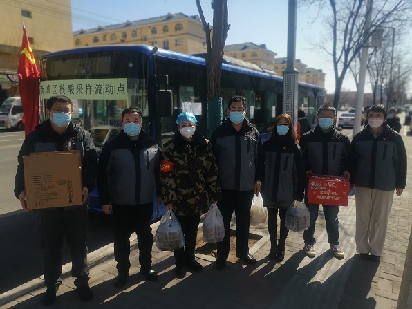 在核酸檢測現(xiàn)場,大家還看望了下沉到該社區(qū)擔(dān)當(dāng)防疫志愿者的物業(yè)公司黨支部書記娜仁同志,此刻的她正身穿防護(hù)服全神貫注地為排隊等候的居民逐一掃描、錄入身份證件信息。在中間休息的片刻時間,娜仁同志為大家簡單介紹了此處疫情防控的最新情況、防控要求及工作人員的配備、交接班制度及用餐作息等情況。她深有感觸地說:"社區(qū)的工作人員、志愿者們每天都很辛苦,厚重且不透氣的防護(hù)服一穿就是七個多小時,中間不吃不喝,更不能上廁所,但大家都憑著堅強(qiáng)的毅力堅持了下來。每當(dāng)脫下厚重的防護(hù)服,大家都感覺渾身像散了架一樣,只想著立刻吃上一口熱乎飯,躺下來好好睡一覺。在這樣的持續(xù)堅守下,大家卻毫無怨言,因為她們知道自己肩負(fù)的責(zé)任和使命是多么光榮和神圣。"她鼓勵前來慰問的同志們,在此次抗擊疫情的非常時期,公司全體黨員要充分發(fā)揮好一個黨員就是一面旗幟的作用,在做好本職工作的同時,積極參加到社區(qū)疫情防控的隊伍中,去做些力所能及的事,為社區(qū)筑牢織密疫情防線貢獻(xiàn)力量!