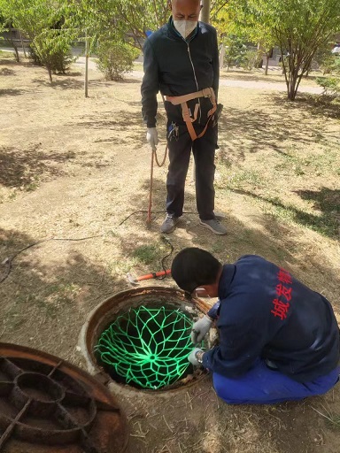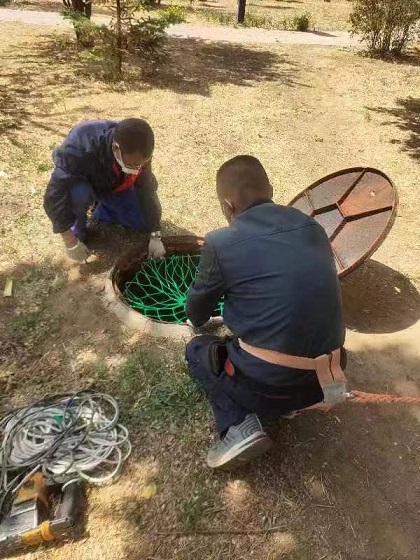 安裝現(xiàn)場(chǎng),工作人員打開井蓋通風(fēng),在用氣體檢測(cè)儀檢測(cè)井內(nèi)的氣體符合作業(yè)條件后,工作人員綁好安全帶用電鉆在井壁上鉆孔,釘入尾端帶鉤的膨脹螺栓,擰緊固定后將防墜網(wǎng)掛到掛鉤上,一張防墜網(wǎng)就安裝完成?,F(xiàn)場(chǎng)工程師傅每完成一個(gè)防墜網(wǎng)的安裝,在確保安全的情況下,都會(huì)親身踩試檢驗(yàn),確保安裝牢固。
