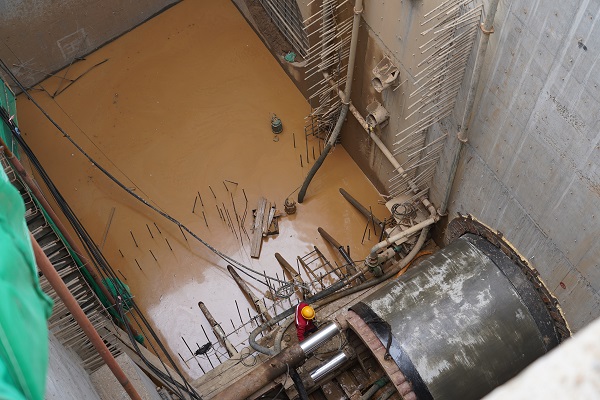 施工現(xiàn)場機(jī)器轟鳴,說話需要提高分貝。一進(jìn)入施工現(xiàn)場,就看到前方有一個(gè)沉井,沉井20米深、13.4*7.3米間方,這個(gè)沉井是挖掘井,在河的對(duì)岸還有一個(gè)深15.5米的接收井。從沉井圍欄邊看井底,下邊的工作人員都顯得特別的渺小,20米深的井相當(dāng)于6層樓高,恐高的人都不敢往下看。