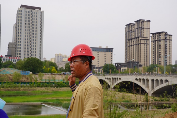 筆者來到成吉思汗大街與哈拉沁路交匯處的路口,遠(yuǎn)遠(yuǎn)就看見一臺(tái)重型吊車矗立在工地圍擋中,圍擋內(nèi)就是跨越東河頂管工程的施工現(xiàn)場。