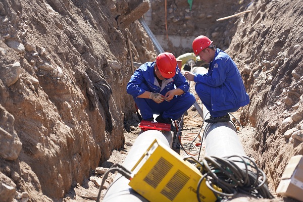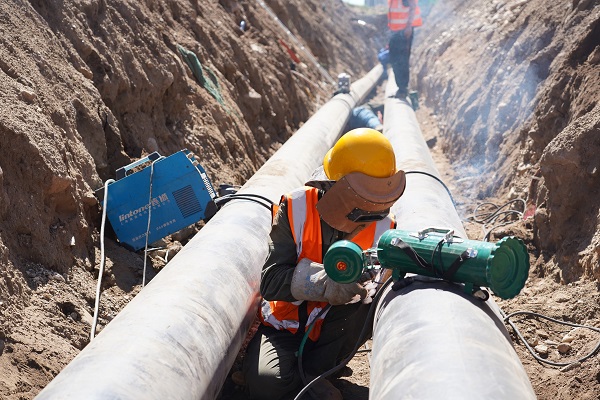 一個工人師傅,側身躺在兩個管道中間的狹小夾縫中,對管道進行焊接。施工單位天津管道公司的段步雨向筆者介紹,"現(xiàn)在這個師傅做的是第二道工序,叫電焊造面。你看到這么長的管子,都是一截一截焊接起來的,焊接要兩道工序,第一道是氬弧焊打底,就是在電弧焊的周圍通上保護氣體----氬氣,使焊材不能和空氣中的氧氣接觸,從而防止了焊材的氧化,所以第一遍要用氬弧焊,就是為了焊口不生銹,確保它的使用年限。氬弧焊完成后,為了管道外壁齊平,焊口更牢靠,再進行第二遍電焊造面。"