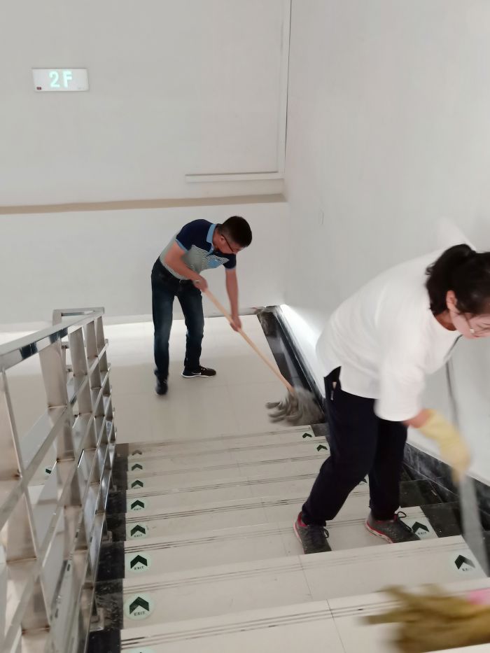 主站樓部分是攻堅(jiān)之戰(zhàn),30位員工在透明的頂棚下感受悶熱灼曬、揮汗如雨,每一塊地磚都是經(jīng)過(guò)了水沖、塵推、除塵、清洗、抹凈、擦干等六道工序,方可達(dá)標(biāo)。上下兩層共26912平方米,經(jīng)過(guò)兩天半的時(shí)間終于完工,看著光亮如新、纖塵不染的候車廳,所有員工的臉上都綻放了發(fā)自內(nèi)心的微笑。